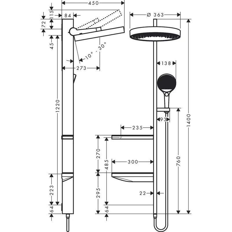 Вылет верхнего душа, см:27.3